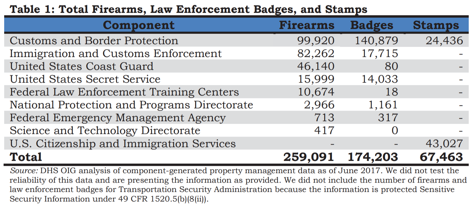 An Inspector General Government Accountability Office report “DHS’ Controls Over Firearms and Other Sensitive Assets” published October 25th shows that the U.S. Homeland Security Department lost 220 guns, 1,889 badges and 25 secure immigration stamps over a three-year period from 2014 to 2016.